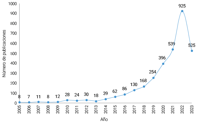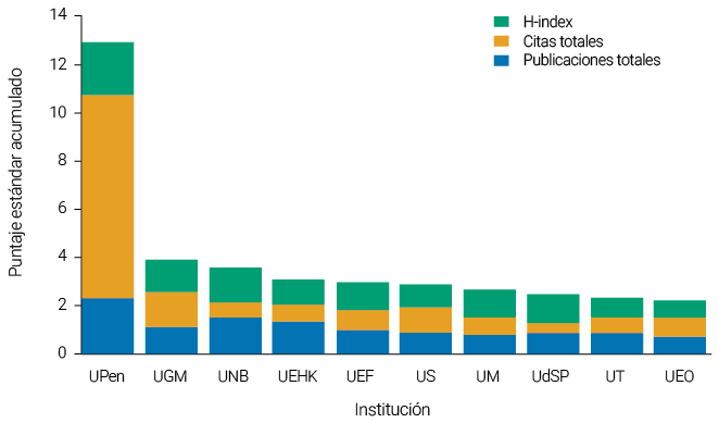 Se define como autor e institución productiva a aquellos que tengan cinco o más publicaciones relacionadas al tema de estudio. Esta consideración se basa en la cantidad de instituciones y autores presentes. En el caso de los autores, se tiene un total de 319 autores, de los cuales el 5 % superior (respecto a la cantidad de publicaciones) tiene cinco o más publicaciones. Respecto a las instituciones, se cuentan 310, de las cuales 54 tienen cinco o más publicaciones, es decir el 17 %. La decisión de utilizar un porcentaje mayor para las instituciones (17 %) en comparación con el porcentaje utilizado para los autores (5 %) se basa en la naturaleza y el alcance de su contribución en el contexto del análisis bibliométrico.