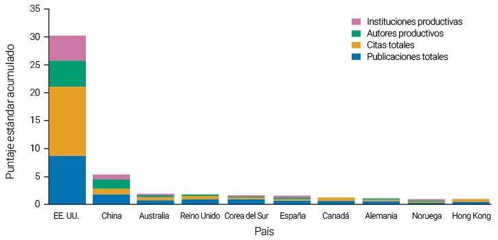 Con base en la Tabla 6, se menciona que A. L. Duckworth se encuentra en el primer lugar y que posee la mayor cantidad de publicaciones, citas e índice H referido de todos los autores. Es necesario mencionar que Duckworth forma parte de la Universidad de Pensilvania, la institución más relevante. Además, es autora, junto con otros, de Duckworth et al. (2007), el primer artículo relacionado al grit de todos los artículos analizados. Por otra parte, D. R. Kelly fue parte de la investigación de Duckworth et al. (2007) y, además, se encuentra en el segundo lugar como autor más relevante, con un promedio de citas por documento de 610, el mayor de todos los autores analizados. Ambos autores están afiliados a instituciones de Estados Unidos, lo cual reafirma la importancia de este país en el tema en estudio.