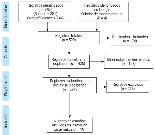 El proceso de selección se detalla en la Figura 1, conforme a las directrices PRISMA. Inicialmente, se identificaron 599 registros: 381 provenientes de Scopus, 214 de Web of Science y 4 obtenidos mediante búsqueda manual en Google Scholar.