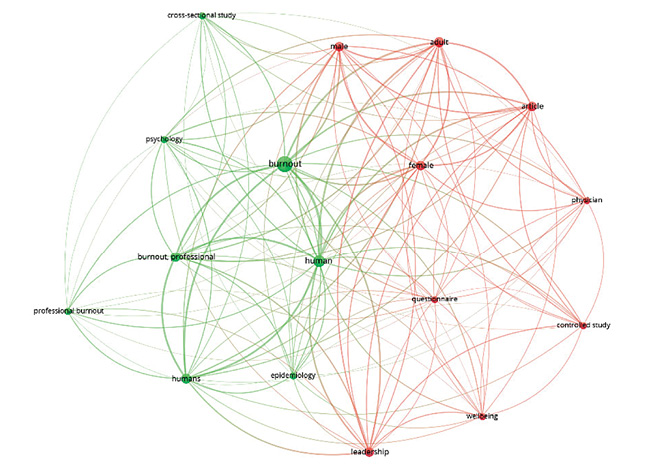 Dada la complejidad y la naturaleza multifacética de la relación entre el burnout, la toma de decisiones y el desempeño del liderazgo en diversos niveles jerárquicos, con el fin de obtener una visión estructural de este campo de investigación, se complementó la síntesis narrativa con un análisis bibliométrico de la literatura seleccionada (Donthu et al., 2021). Específicamente, se realizó un análisis de coocurrencia de palabras clave utilizando el software VOSviewer (Van Eck & Waltman, 2010). Se fijó un umbral de tres coocurrencias, ya que representa un punto de equilibrio: incluye los términos más relevantes y consolidados, al mismo tiempo que limita el ruido de palabras muy poco frecuentes. Al usar este valor intermedio, la red resultante muestra clústeres temáticos claros sin sacrificar información valiosa ni sobrecargar la visualización. Esta técnica permite identificar los términos más relevantes y sus interconexiones dentro del corpus de estudios, revelando los principales focos temáticos y la estructura conceptual del área de investigación (Zupic & Čater, 2015).